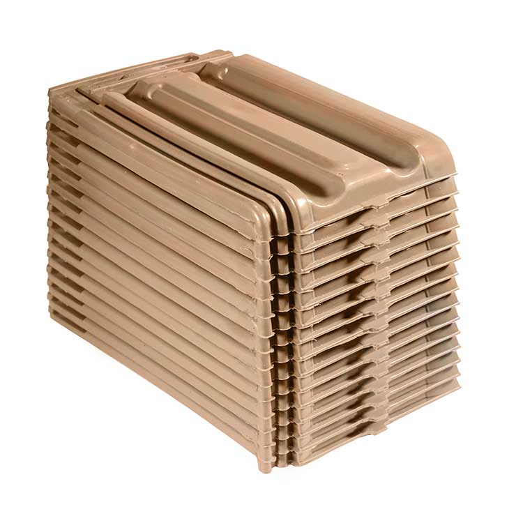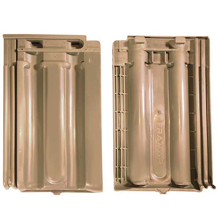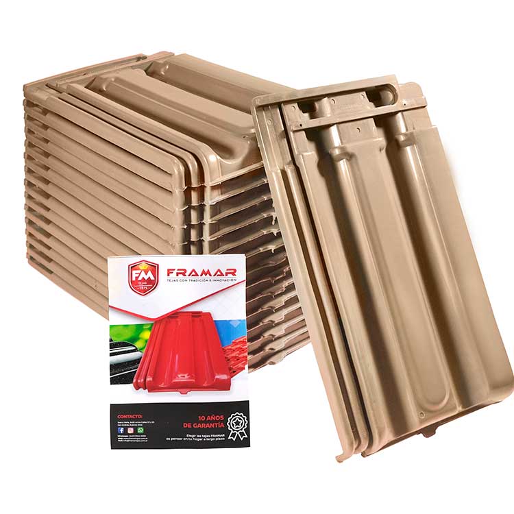 La teja francesa plástica FRAMAR está diseñada para ofrecer la estética tradicional de la teja cerámica con la resistencia del polipropileno. Su peso ultraliviano de solo 430 gramos por unidad permite una instalación rápida, segura y con menor exigencia estructural en tu techo.