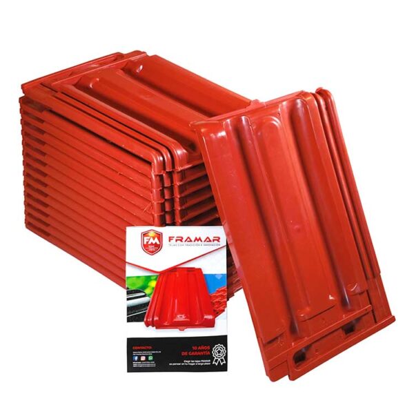 La teja francesa plástica FRAMAR está diseñada para ofrecer la estética tradicional de la teja cerámica con la resistencia del polipropileno. Su peso ultraliviano de solo 430 gramos por unidad permite una instalación rápida, segura y con menor exigencia estructural en tu techo.